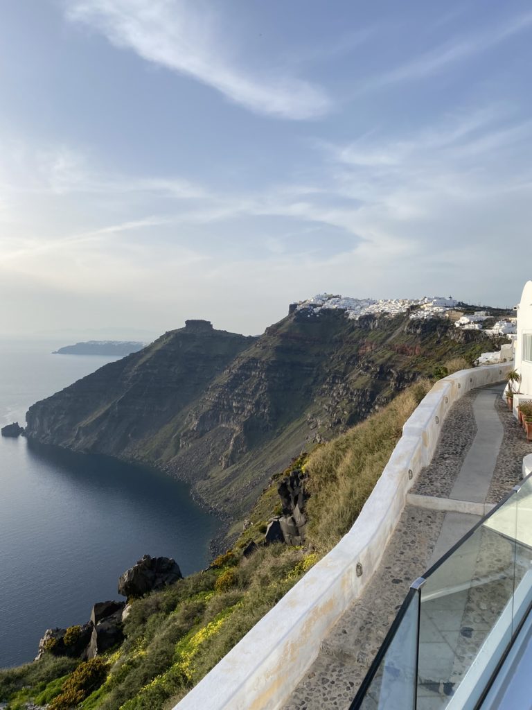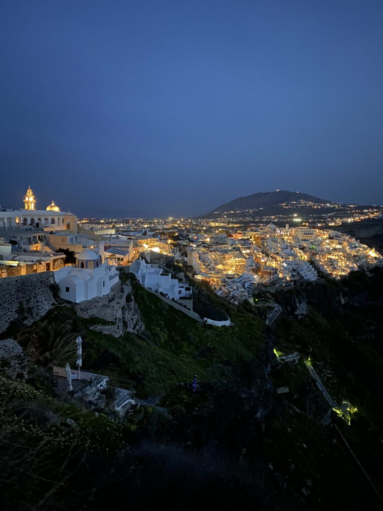 Nosotros paseamos tanto por esa caminería que está al borde por una que pasa de manera mas central entre los diferentes hoteles y casas. Por las dos vías se tienen vistas maravillosas. Lo hicimos tanto de noche como de día, si bien en la noche el mar se verá como una immensidad oscura, la iluminación del pueblo y los hoteles produce un ambiente único y hermoso. Fue genial pasearse en las noches frescas por las diferentes caminerías y disfrutar de la bella arquitectura de Santorini idealmente iluminada para ponerla en valor. Santorini en Grecia